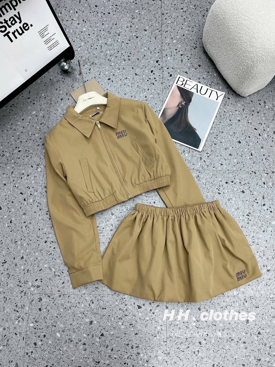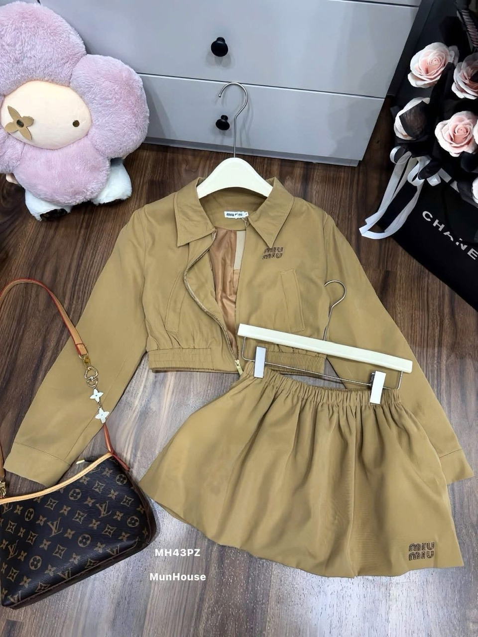 Điểm nhấn: Logo Miu Miu thêu tinh tế trên áo và váy, mang lại cảm giác cao cấp, thời thượng.